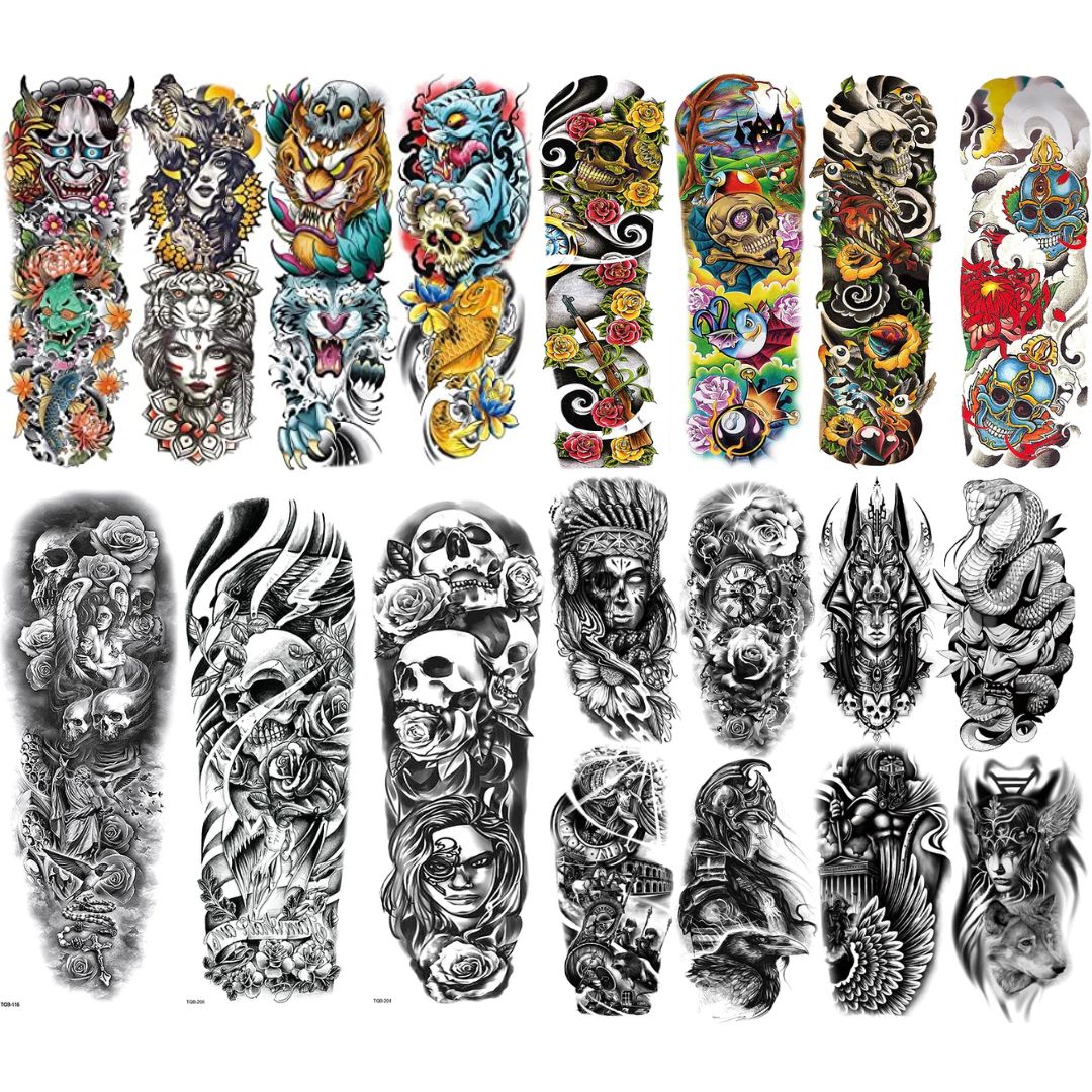 - 【 PACKAGE INCLUDE 】11 Sheets Full arm temporary tattoos (Lasts 3-5 days). 8 Sheets Half Arm temporary tattoo. 19 Sheets in Total