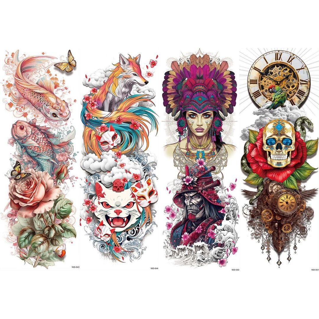 4 Sheets Watercolor Fish Fox Samurai Skull Full Arm Sleeves