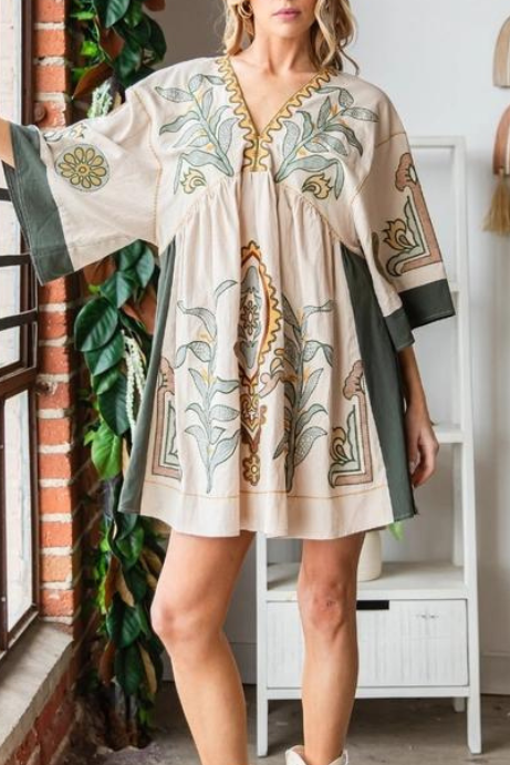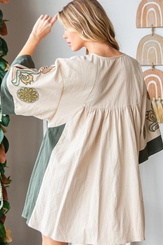 The vintage-inspired bell sleeves and V-neck give a playful twist to this mini-length dress. Pair it with boots for summer rodeos or sandals for a more casual look. This bestselling Beige Embroidery Patch Dress is sure to turn heads at any event. This beauty is also available in other colors!