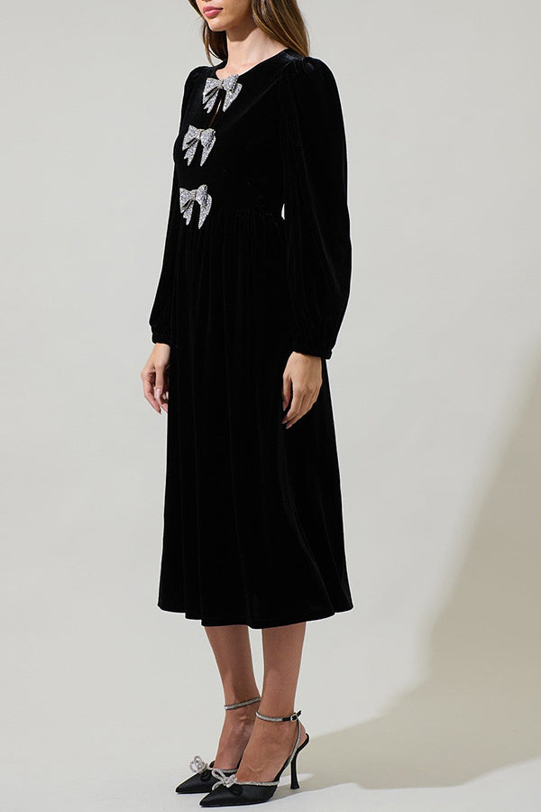 We're glad you've clicked on our new Bow Velvet Midi Dress as we're really into its casual vibes!Shine in our Bow Velvet Midi Dress in Black! With its chic black velvet and three stunning bows in front, this dress is perfect for turning heads at any evening event or special occasion. Pair it with your favorite heels and a clutch for a look that's glamorous and totally.