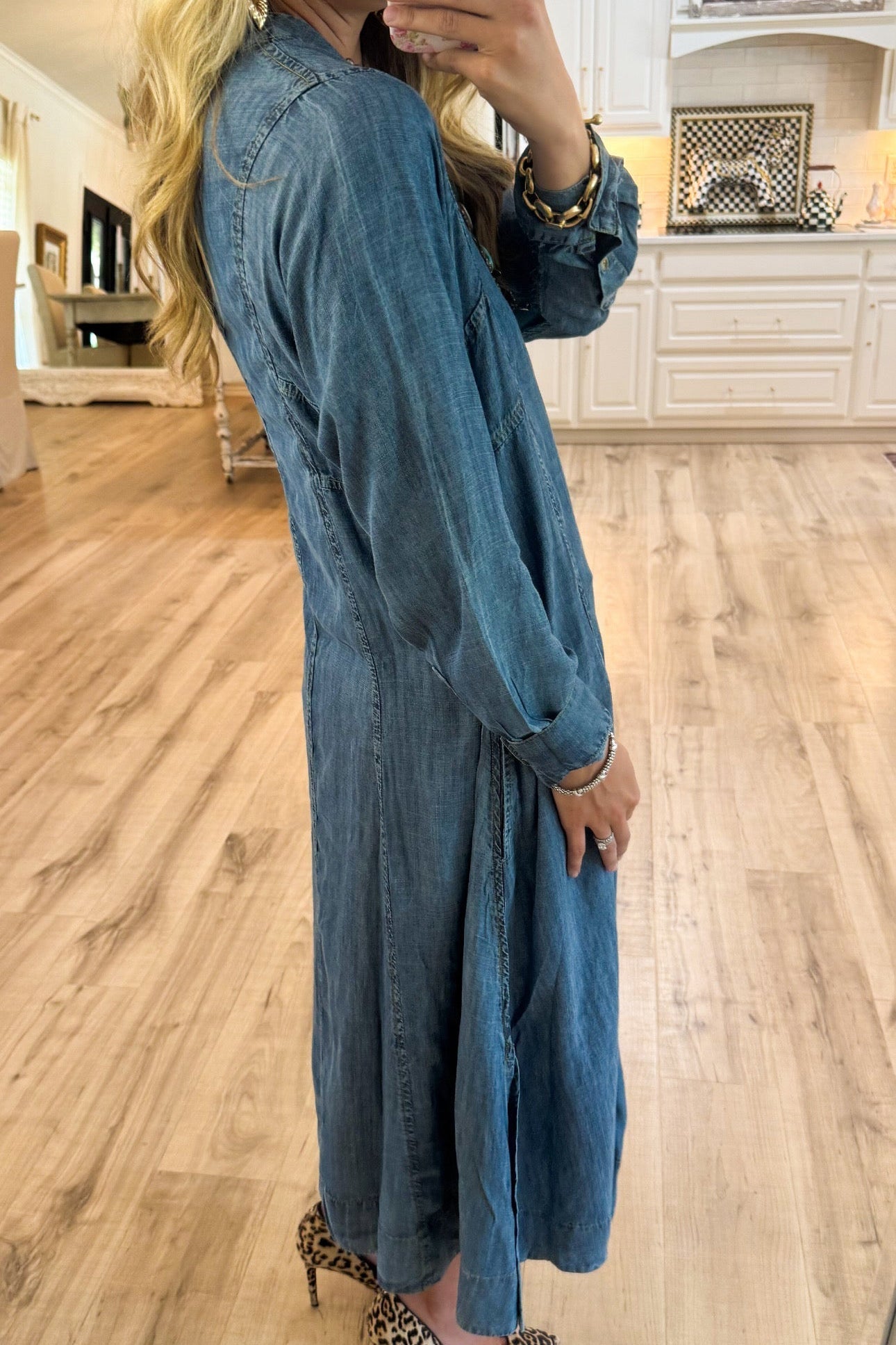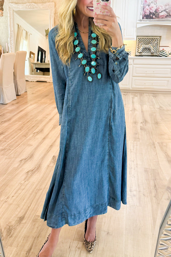 We're glad you've clicked on our new Denim Caftan Pockets Midi Dress as we're really into its casual vibes! The split neckline make this a great choice for any stylish girl.
