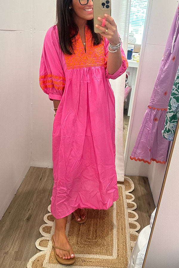 Embroidered Detail Pockets Midi Dress