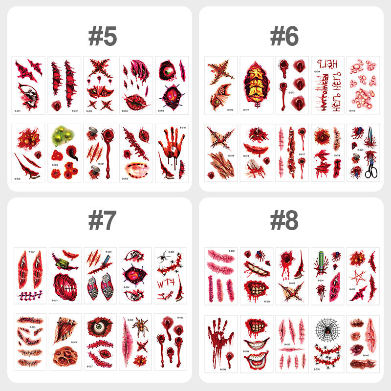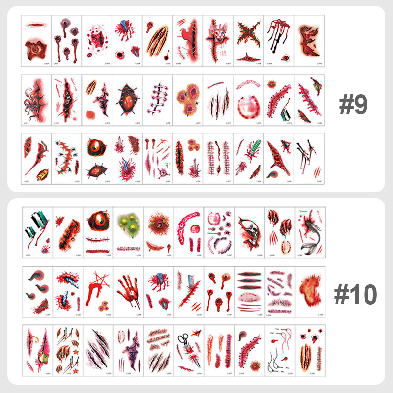 【Great Size】Each tattoos is about 5.7x9.7 cm,and each one includes all kinds of wounds pattern, it's enough to make you look like a creepy character with lots of wounds, match your friends/family Halloween party cosplay & Halloween makeup. A great trick to astonish and scare your friends.