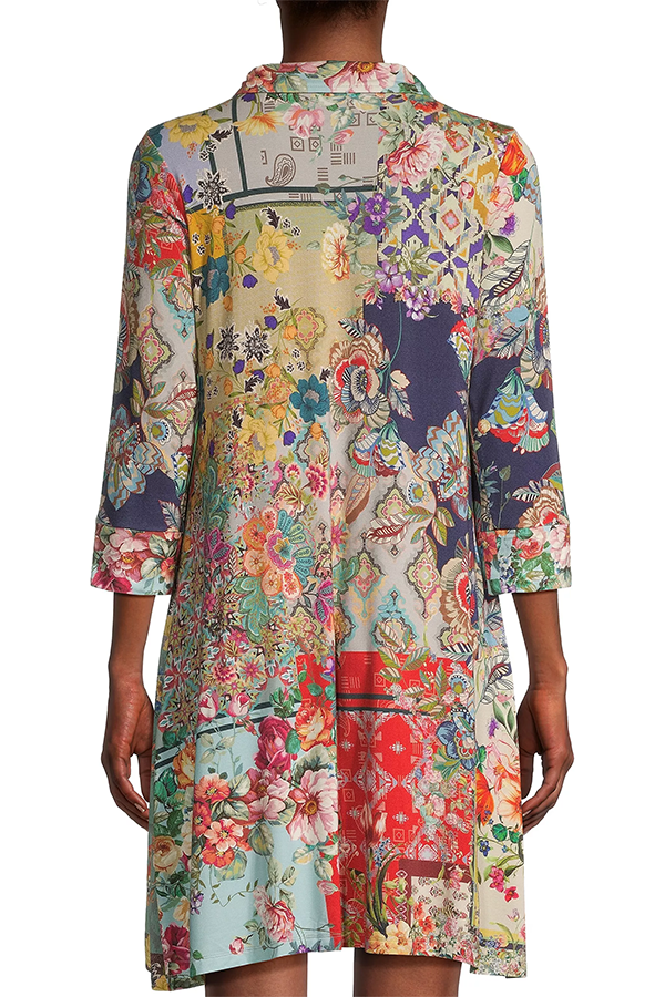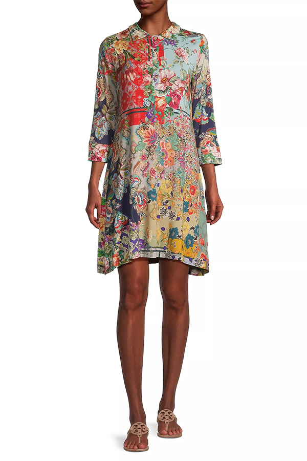 An intricate floral collage decorates this breezy shirtdress