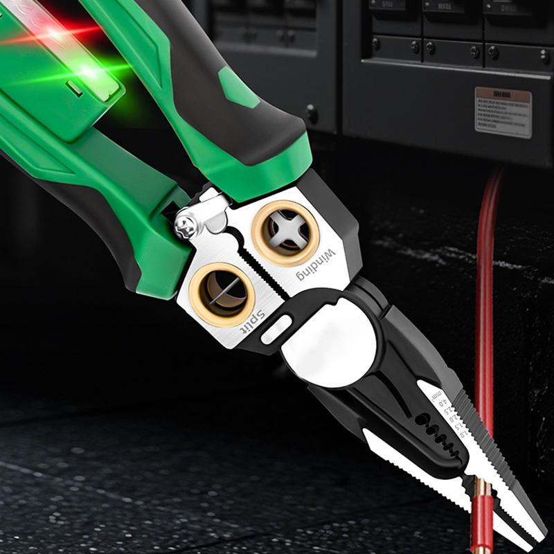 6-IN-1 FUNCTIONALITY: Combines wire cutting, stripping, coiling, splitting, gripping, and voltage testing (12-220V) in one compact tool. The precision-ground high-carbon steel blade makes clean cuts on copper/aluminum wires, while the integrated wire separator quickly splits paired cables without damage. Eliminates the need for carrying multiple tools.