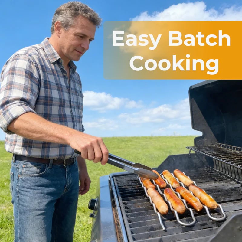 Why flip one by one? This rack lets you grill multiple sausages at once (up to 5 at a time, as shown). Just give it a gentle push with tongs to rotate them all simultaneously. Saves time and space so everyone eats together.